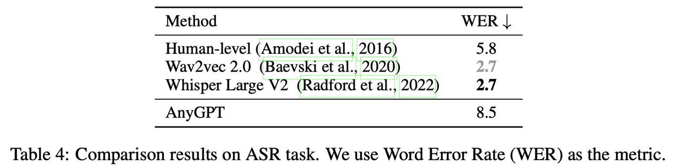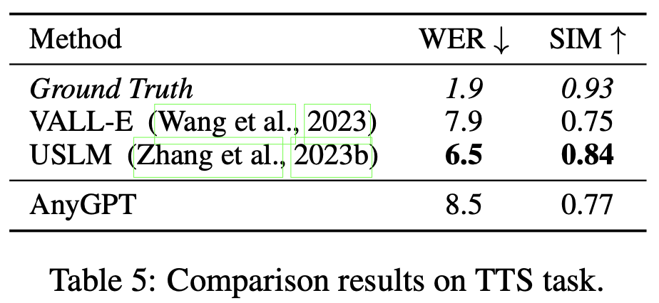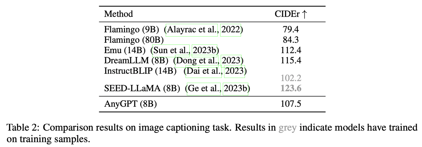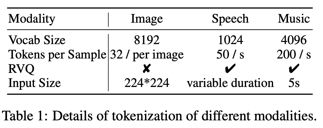<img src="https://imagedelivery.net/phxEHgsq3j8gSnfNAJVJSQ/NODE2_E373E33C-FF3D-4B06-B8AB-D018804ED3DD/public" style="background-color:initial;max-width:min(100%,2148px);max-height:min(1350px);;background-image:url(https://imagedelivery.net/phxEHgsq3j8gSnfNAJVJSQ/NODE2_E373E33C-FF3D-4B06-B8AB-D018804ED3DD/public);height:auto;width:100%;object-fit:cover;background-size:cover;display:block;" width="2148" height="1350"> <ul class="dashed" data-apple-notes-indent-amount="0"><li><span style="font-family: '.PingFangSC-Regular'">文章标题:</span>AnyGPT: Unified Multimodal LLM with Discrete Sequence Mod- eling</li><li><span style="font-family: '.PingFangSC-Regular'">文章地址:</span><a href="https://arxiv.org/abs/2402.12226">https://arxiv.org/abs/2402.12226</a> </li><li>ACL 2024</li></ul> 文章提出了一个名为AnyGPT的多模态大模型,包含语音,文本,图片和音乐,该模型能够实现多模态输入和输出,并且将所有模态都看作离散的表示,统一处理所有模态,而内核使用大语言模型LLM进行建模,因此该模型可以在现有的LLM框架上去训练,仅仅在数据处理层面上有所差异,将新的模态无缝地加入到模型中。此外,文章为了训练模型,构造了一个多模态的指令数据集用于多模态到多模态的对齐。 当前有很多多模态大模型,但都是以多模态输入为主,很少有同时具备多模态理解和输出的能力。如果有同时具备两者能力的模型,其处理多模态信息的方式较复杂,并且需要修改现有的模型和方法,训练的难度较大。为此,文章提出了一种简单有效的模型,用统一的离散表示来统一处理多模态数据。文章的贡献如下: - 提出了基于token的多模态大模型AnyGPT,能够同时理解和生成多模态数据。 - 构造了多模态混合的多轮对话数据集AnyInstruct-108k - 展示了离散表示可以在语言模型中有效地统一多个模态 下面介绍一下AnyGPT,首先介绍tokenizer。对于图片模态数据,模型使用SEED tokenizer,该tokenizer于2023年提出,专用于图片模态的离散表示。对于语音模态数据,模型使用SpeechTokenizer的RVQ-1,也就是第一层token,该层token包含着语音数据的语义信息。最后对于音乐模态,对于该模态,文章使用了Encodec对其进行tokenize,在该文章的设置中由于Encodec的离散编码有四层,文章将每一帧四层token平铺,得到一维的离散表示。 下表展示了各模态token化的细节。 <img src="https://imagedelivery.net/phxEHgsq3j8gSnfNAJVJSQ/NODE2_EE3C4B1C-3A82-40B3-983B-D2EF42B2BB14/public" style="background-color:initial;max-width:min(100%,1054px);max-height:min(418px);;background-image:url(https://imagedelivery.net/phxEHgsq3j8gSnfNAJVJSQ/NODE2_EE3C4B1C-3A82-40B3-983B-D2EF42B2BB14/public);height:auto;width:100%;object-fit:cover;background-size:cover;display:block;" width="1054" height="418"> 在数据生成阶段,对于不同模态的高质量生成同样存在巨大的挑战。在LLM得到各模态语义token输出后,文章提出了两阶段框架,对不同模态进行了不同的处理,实现了高质量的数据生成。对于图片模态,将SEEDtoken作为扩散模型的输入,实现了图片的高质量生成。对于语音数据,该模型得到语义token后,使用SoundStorm模型以非自回归方式生成了语音数据的声学token,然后再将语义token和声学token共同解码,得到了高质量的语音数据,该SoundStorm模型使用SpeechTokenizer的token进行训练。最后对于音乐模态数据,直接将得到的token重新组织成四层token并解码得到音乐数据。 然后就是构造一些模态对其的数据用于模型的训练,这部分由于不是重点就省略了,具体可看原文。 下面展示一下模型的实验结果,可见模型在图像理解,图像生成,语音识别,TTS,音乐理解和生成,多个模态的任务上都能达到较好的水准。 <img src="https://imagedelivery.net/phxEHgsq3j8gSnfNAJVJSQ/NODE2_688CCE28-A029-4C64-B6B0-11230204EE34/public" style="background-color:initial;max-width:min(100%,1904px);max-height:min(664px);;background-image:url(https://imagedelivery.net/phxEHgsq3j8gSnfNAJVJSQ/NODE2_688CCE28-A029-4C64-B6B0-11230204EE34/public);height:auto;width:100%;object-fit:cover;background-size:cover;display:block;" width="1904" height="664"> <img src="https://imagedelivery.net/phxEHgsq3j8gSnfNAJVJSQ/NODE2_4AF6928A-94C8-4C98-9F79-F7A238814308/public" style="background-color:initial;max-width:min(100%,1874px);max-height:min(462px);;background-image:url(https://imagedelivery.net/phxEHgsq3j8gSnfNAJVJSQ/NODE2_4AF6928A-94C8-4C98-9F79-F7A238814308/public);height:auto;width:100%;object-fit:cover;background-size:cover;display:block;" width="1874" height="462"> <img src="https://imagedelivery.net/phxEHgsq3j8gSnfNAJVJSQ/NODE2_BBF3D90B-C048-40A6-B05B-70BA6028CBA4/public" style="background-color:initial;max-width:min(100%,1716px);max-height:min(428px);;background-image:url(https://imagedelivery.net/phxEHgsq3j8gSnfNAJVJSQ/NODE2_BBF3D90B-C048-40A6-B05B-70BA6028CBA4/public);height:auto;width:100%;object-fit:cover;background-size:cover;display:block;" width="1716" height="428"> <img src="https://imagedelivery.net/phxEHgsq3j8gSnfNAJVJSQ/NODE2_1B8EEDAE-9BEC-49CC-BE2D-30818A731552/public" style="background-color:initial;max-width:min(100%,924px);max-height:min(426px);;background-image:url(https://imagedelivery.net/phxEHgsq3j8gSnfNAJVJSQ/NODE2_1B8EEDAE-9BEC-49CC-BE2D-30818A731552/public);height:auto;width:100%;object-fit:cover;background-size:cover;display:block;" width="924" height="426"> 最后,文章提到了未来的方向和AnyGPT的局限: - Any-to-Any多模态大模型的评判基准(Benchmark) - 加强LLM,扩大规模或者使用混合专家模型MOE - 更好的tokenizer - 更长的context上下文,对于AnyGPT只支持5s的音乐