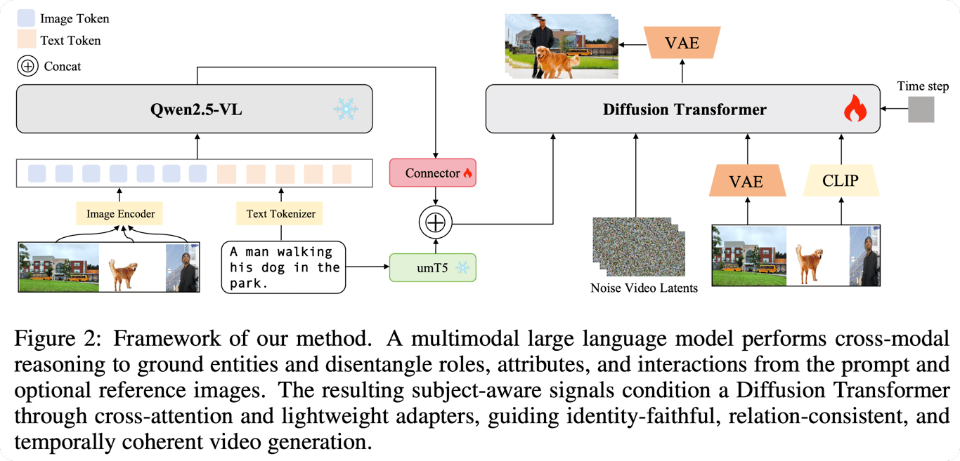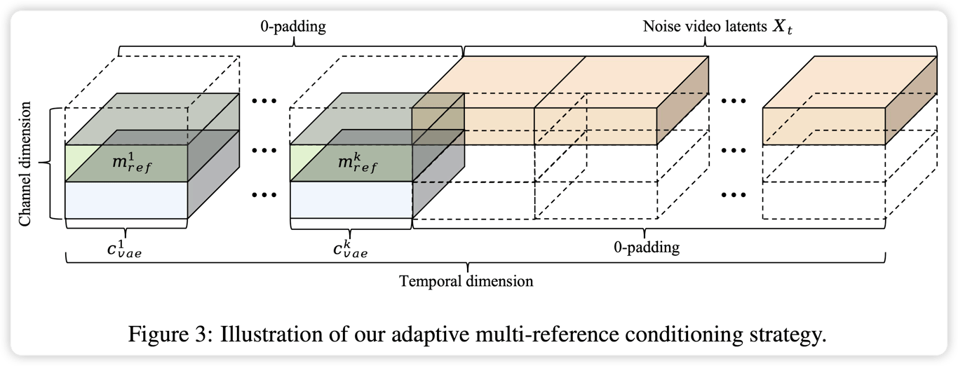 <ul class="dashed" data-apple-notes-indent-amount="0"><li><span style="font-family: '.PingFangUITextSC-Regular'">文章标题:</span>BINDWEAVE: SUBJECT-CONSISTENT VIDEO GENERATION VIA CROSS-MODAL INTEGRATION</li><li><span style="font-family: '.PingFangSC-Regular'">文章地址:</span><a href="https://arxiv.org/abs/2510.00438">https://arxiv.org/abs/2510.00438</a> </li><li>arxiv 2025(ICLR2026在投4466)</li></ul> <img src="https://imagedelivery.net/phxEHgsq3j8gSnfNAJVJSQ/node3_92627681-84f5-4350-86d5-4b8716333ad4/public" style="background-color:initial;max-width:min(100%,2484px);max-height:min(1196px);;background-image:url(https://imagedelivery.net/phxEHgsq3j8gSnfNAJVJSQ/node3_92627681-84f5-4350-86d5-4b8716333ad4/public);height:auto;width:100%;object-fit:cover;background-size:cover;display:block;" width="2484" height="1196"> 模型框架如上图,主要创新点在于左半部分,所谓的跨模态混合信息就是利用MLLM做一个信息融合,得到hidden state后接入一个可训练的MLP作为混合信息,该信息与原文本信息进行concate得到联合信息,输入到原模型的文本cross attention当中。此外,为了引入细粒度的参考图像信息,将参考图像经过vae进行编码后以一种类似Wan2.1-I2V的方式进行条件输入,如下图: <img src="https://imagedelivery.net/phxEHgsq3j8gSnfNAJVJSQ/node3_47089282-8f53-4b73-98d0-228f37baa400/public" style="background-color:initial;max-width:min(100%,3204px);max-height:min(1226px);;background-image:url(https://imagedelivery.net/phxEHgsq3j8gSnfNAJVJSQ/node3_47089282-8f53-4b73-98d0-228f37baa400/public);height:auto;width:100%;object-fit:cover;background-size:cover;display:block;" width="3204" height="1226"> 另外还同Wan2.1-I2V将参考图像的clip特征以cross attention方式注入到模型中,这个地方多参考图像是如何处理的?
