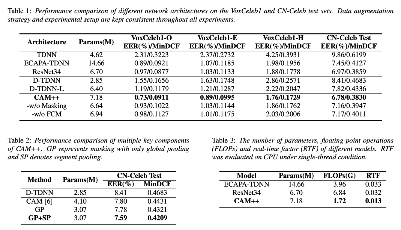 <img src="https://imagedelivery.net/phxEHgsq3j8gSnfNAJVJSQ/NODE2_AD6A4929-E60F-4288-84AC-B9CEBF971BAA/public" style="background-color:initial;max-width:min(100%,850px);max-height:min(1056px);;background-image:url(https://imagedelivery.net/phxEHgsq3j8gSnfNAJVJSQ/NODE2_AD6A4929-E60F-4288-84AC-B9CEBF971BAA/public);height:auto;width:100%;object-fit:cover;background-size:cover;display:block;" width="850" height="1056"> <ul class="dashed" data-apple-notes-indent-amount="0"><li><span style="font-family: '.PingFangSC-Regular'">文章标题:</span>CAM++: A Fast and Efficient Network for Speaker Verification Using Context-Aware Masking</li><li><span style="font-family: '.PingFangSC-Regular'">文章地址:</span><a href="https://arxiv.org/abs/2303.00332">https://arxiv.org/abs/2303.00332</a> </li><li>未投</li></ul> TDNN(Time delay neural network)是说话人识别任务中十分有效的模型(我的理解其实就是一维的卷积网络),基于该结构的ECAPA-TDNN在说话人识别是SOTA模型,但其需要较高的计算资源和较慢的推理速度,因此,作者提出了一个基于上下文感知掩码的高效的网络:CAM++,使用了D-TDNN(densely connected time delay neural network)作为骨干网络和全新的多尺度池化去捕捉不同尺度下的上下文信息。 CAM++的结构如主图,主要由两部分组成:the front-end convolution module (FCM) and the D-TDNN backbone。FCM主要由几个残差连接的二维卷积块构成,提取特征,随后输入到D-TDNN中。D-TDNN由三个Dense Block组成,每个block由多个layer稠密连接构成,而对每个layer,文中使用了改进的CAM模块对TDNN的输出进行权重分配,多尺度的池化可以使其具有全局和局部的上下文信息。其中得到的mask公式如下: <img src="https://imagedelivery.net/phxEHgsq3j8gSnfNAJVJSQ/NODE2_1D6D8727-7139-4CA1-8043-FB80EDE37D79/public" style="background-color:initial;max-width:min(100%,806px);max-height:min(150px);;background-image:url(https://imagedelivery.net/phxEHgsq3j8gSnfNAJVJSQ/NODE2_1D6D8727-7139-4CA1-8043-FB80EDE37D79/public);height:auto;width:100%;object-fit:cover;background-size:cover;display:block;" width="806" height="150"> eg和es分别为全局特征和局部特征,k为局部切片数,sk为第k个切片的开始帧。 最后得到layer输出为: <img src="https://imagedelivery.net/phxEHgsq3j8gSnfNAJVJSQ/NODE2_4281E7BB-BBE1-496C-B58B-3D710C1C962C/public" style="background-color:initial;max-width:min(100%,350px);max-height:min(64px);;background-image:url(https://imagedelivery.net/phxEHgsq3j8gSnfNAJVJSQ/NODE2_4281E7BB-BBE1-496C-B58B-3D710C1C962C/public);height:auto;width:100%;object-fit:cover;background-size:cover;display:block;" width="350" height="64"> 其中F(X)为TDNN的输出。 实验部分结果如下,可以看到CAM++在增加少量的参数下实现了最好的的表现性能和推理速度: <img src="https://imagedelivery.net/phxEHgsq3j8gSnfNAJVJSQ/NODE2_453625B3-C1A9-4146-AA6F-3228146B4CE4/public" style="background-color:initial;max-width:min(100%,2406px);max-height:min(1382px);;background-image:url(https://imagedelivery.net/phxEHgsq3j8gSnfNAJVJSQ/NODE2_453625B3-C1A9-4146-AA6F-3228146B4CE4/public);height:auto;width:100%;object-fit:cover;background-size:cover;display:block;" width="2406" height="1382">