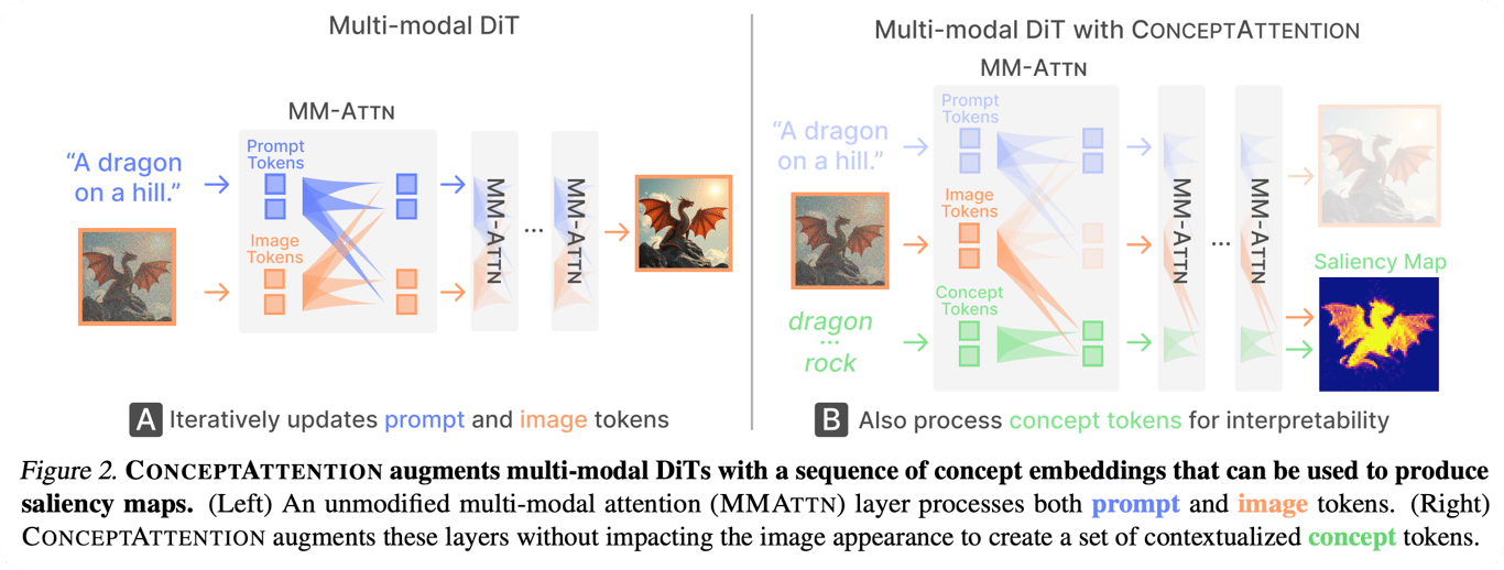 <ul class="dashed" data-apple-notes-indent-amount="0"><li><span style="font-family: '.PingFangUITextSC-Regular'">文章标题:</span>ConceptAttention: Diffusion Transformers Learn Highly Interpretable Features</li><li><span style="font-family: '.PingFangSC-Regular'">文章地址:</span><a href="https://arxiv.org/abs/2502.04320">https://arxiv.org/abs/2502.04320</a> </li><li>ICML2025</li></ul> <img src="https://imagedelivery.net/phxEHgsq3j8gSnfNAJVJSQ/node3_da2aed87-0115-4877-b0b4-c2153acd9947/public" style="background-color:initial;max-width:min(100%,2312px);max-height:min(878px);;background-image:url(https://imagedelivery.net/phxEHgsq3j8gSnfNAJVJSQ/node3_da2aed87-0115-4877-b0b4-c2153acd9947/public);height:auto;width:100%;object-fit:cover;background-size:cover;display:block;" width="2312" height="878"> 作者提出了ConceptAttention,通过在推理时引入额外的概念token,并在attention计算中进行设计,完成了概念的显著图的提取,无需任何训练过程,可以完成图像分割等任务。 <img src="https://imagedelivery.net/phxEHgsq3j8gSnfNAJVJSQ/node3_21e7f68e-ca9e-4444-8cec-eac3e53e19fc/public" style="background-color:initial;max-width:min(100%,1126px);max-height:min(1276px);;background-image:url(https://imagedelivery.net/phxEHgsq3j8gSnfNAJVJSQ/node3_21e7f68e-ca9e-4444-8cec-eac3e53e19fc/public);height:auto;width:100%;object-fit:cover;background-size:cover;display:block;" width="1126" height="1276">