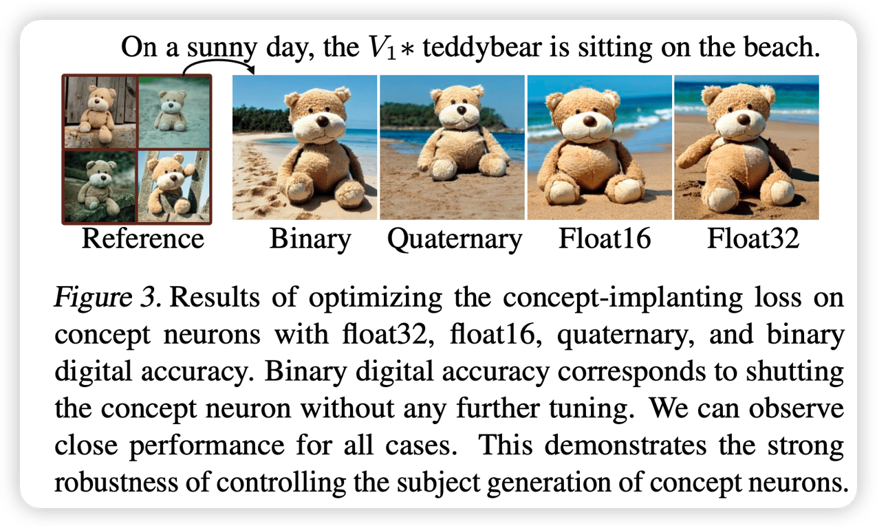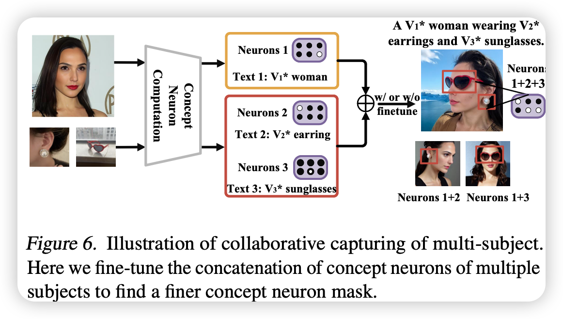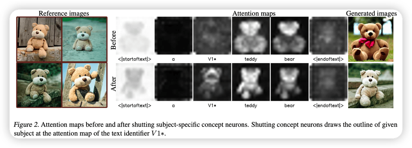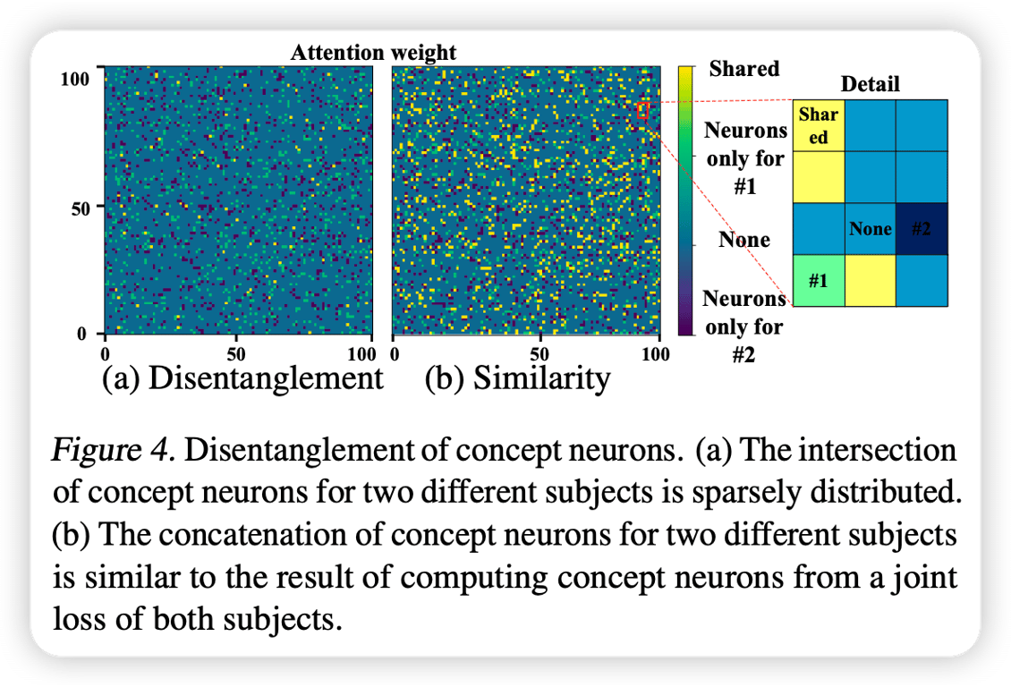 <ul class="dashed" data-apple-notes-indent-amount="0"><li><span style="font-family: '.PingFangUITextSC-Regular'">文章标题:</span>Cones: Concept Neurons in Diffusion Models for Customized Generation</li><li><span style="font-family: '.PingFangSC-Regular'">文章地址:</span><a href="https://arxiv.org/abs/2303.05125">https://arxiv.org/abs/2303.05125</a> </li><li>ICML 2023</li></ul> <img src="https://imagedelivery.net/phxEHgsq3j8gSnfNAJVJSQ/NODE2_8FA688CF-8BBE-4C12-894D-98025037E23A/public" style="background-color:initial;max-width:min(100%,1164px);max-height:min(1078px);;background-image:url(https://imagedelivery.net/phxEHgsq3j8gSnfNAJVJSQ/NODE2_8FA688CF-8BBE-4C12-894D-98025037E23A/public);height:auto;width:100%;object-fit:cover;background-size:cover;display:block;" width="1164" height="1078"><ul class="dashed" data-apple-notes-indent-amount="0"><li></li></ul> 人脑对于不同语义特征的刺激会有不同的神经元做出反应。文章探讨现代的深度神经网络是否也存在这种行为。具体来说,文章在扩散模型中找到了对特定概念做出反应的神经元的小集合。作者称这些神经元为概念神经元,可以通过特定概念的刺激,对网络中梯度进行数据分析来识别这些神经元。这些概念神经元在对生成结果的解释性和编辑性展示了非常吸引人的特性。关闭这些神经元(将值设为0)可以直接生成对应的概念在不同的场景中。将多个概念神经元集合串联起来可以清晰地在一张图片中生成所有相关的概念,更进一步微调几步可以增强多概念的生成能力,可能是第一个可以可控生成四个及以上概念在一张图像的方法。对于大规模应用,这些概念神经元对硬件环境非常友好,因为仅需要存储一个稀疏的整数索引的集合,而不是float32类型的值,相比之前的对象驱动的生成方法减少了90%的存储消耗。 具体来说,这些概念神经元就是扩散模型中的一些参数,并且只聚焦于模型中的KV层,这些参数如果满足以下条件,就视为我们的概念神经元: <img src="https://imagedelivery.net/phxEHgsq3j8gSnfNAJVJSQ/NODE2_878134AE-49C9-4145-80B9-6738F029BBF3/public" style="background-color:initial;max-width:min(100%,800px);max-height:min(384px);;background-image:url(https://imagedelivery.net/phxEHgsq3j8gSnfNAJVJSQ/NODE2_878134AE-49C9-4145-80B9-6738F029BBF3/public);height:auto;width:100%;object-fit:cover;background-size:cover;display:block;" width="800" height="384"> 其实很好理解:我们的目的是找到一组参数,该参数满足其绝对值减少时,DreamBooth的重建损失也会减少,因此对于正参数来说,其梯度大于0,对于负参数来说,其梯度小于0。从而作者就提出了主图中的算法,来识别这些概念神经元:首先这些神经元从0到初始值都满足上面的条件,可以放宽这个条件,即从中间进行K次采样,其和大于某个特定的超参数,对于采样作者设计了一个方式,该采样方式在参数值与其对应的梯度值相乘的绝对值非常小的时候采样更稠密,相反更稀疏,从而可以同时过滤掉那些满足条件比较模糊的区域的参数。 下图可见,在关闭概念神经元之后,特定的token的注意力图呈现了特定概念的轮廓。说明了这些神经元与相关的概念具有很强的联系。 <img src="https://imagedelivery.net/phxEHgsq3j8gSnfNAJVJSQ/NODE2_8A5565E4-4AE4-438B-9BA5-AF2BB3006C9B/public" style="background-color:initial;max-width:min(100%,1550px);max-height:min(558px);;background-image:url(https://imagedelivery.net/phxEHgsq3j8gSnfNAJVJSQ/NODE2_8A5565E4-4AE4-438B-9BA5-AF2BB3006C9B/public);height:auto;width:100%;object-fit:cover;background-size:cover;display:block;" width="1550" height="558"> 并且,在神经元的值于不同精度下,其结果都非常接近,这展示了控制对象生成中这些概念神经元的鲁棒性。 <img src="https://imagedelivery.net/phxEHgsq3j8gSnfNAJVJSQ/NODE2_B46D8235-D037-45AC-87C8-F2105375C7E1/public" style="background-color:initial;max-width:min(100%,1588px);max-height:min(956px);;background-image:url(https://imagedelivery.net/phxEHgsq3j8gSnfNAJVJSQ/NODE2_B46D8235-D037-45AC-87C8-F2105375C7E1/public);height:auto;width:100%;object-fit:cover;background-size:cover;display:block;" width="1588" height="956"> 概念神经元还具有良好的叠加性,用于多概念生成。如下图,同时将两个对象的概念神经元关闭,可以实现两个概念的同时生成。 <img src="https://imagedelivery.net/phxEHgsq3j8gSnfNAJVJSQ/NODE2_63CBFCB9-2309-4C4D-B8D9-1497F7646D65/public" style="background-color:initial;max-width:min(100%,1200px);max-height:min(686px);;background-image:url(https://imagedelivery.net/phxEHgsq3j8gSnfNAJVJSQ/NODE2_63CBFCB9-2309-4C4D-B8D9-1497F7646D65/public);height:auto;width:100%;object-fit:cover;background-size:cover;display:block;" width="1200" height="686"> 对于多个对象的生成,可以将这些概念神经元组合起来,通过进一步微调,可以得到更加精细的概念神经元集合掩码。 <img src="https://imagedelivery.net/phxEHgsq3j8gSnfNAJVJSQ/NODE2_264B6D0A-ED77-42E6-903C-58459815072C/public" style="background-color:initial;max-width:min(100%,1162px);max-height:min(658px);;background-image:url(https://imagedelivery.net/phxEHgsq3j8gSnfNAJVJSQ/NODE2_264B6D0A-ED77-42E6-903C-58459815072C/public);height:auto;width:100%;object-fit:cover;background-size:cover;display:block;" width="1162" height="658"> 并且,文章还展示了不同概念的神经元共享的神经元的数量是非常少的,并且将不同概念的神经元组合起来的集合与从头开始发现他们的集合有超过50%的相似度。 <img src="https://imagedelivery.net/phxEHgsq3j8gSnfNAJVJSQ/NODE2_2F4ED6E4-B515-49C7-BBE2-6369C0A75067/public" style="background-color:initial;max-width:min(100%,1184px);max-height:min(804px);;background-image:url(https://imagedelivery.net/phxEHgsq3j8gSnfNAJVJSQ/NODE2_2F4ED6E4-B