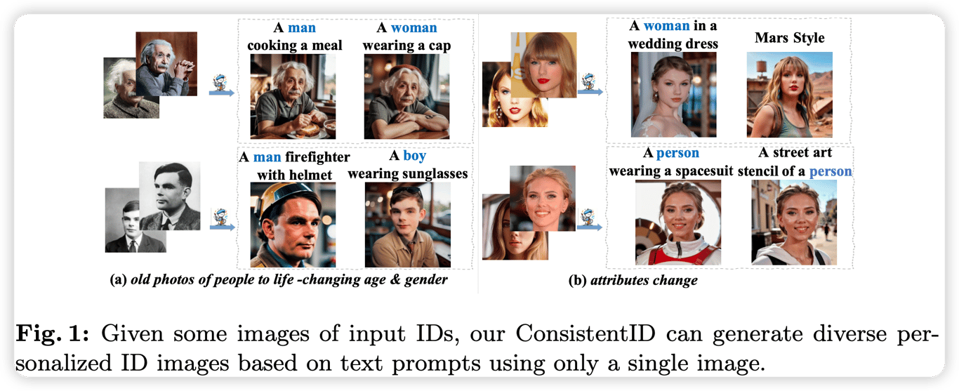 <ul class="dashed" data-apple-notes-indent-amount="0"><li><span style="font-family: '.PingFangUITextSC-Regular'">文章标题:</span>ConsistentID : Portrait Generation with Multimodal Fine-Grained Identity Preserving</li><li><span style="font-family: '.PingFangSC-Regular'">文章地址:</span><a href="https://arxiv.org/abs/2404.16771">https://arxiv.org/abs/2404.16771</a> </li><li>arxiv</li></ul> <img src="https://imagedelivery.net/phxEHgsq3j8gSnfNAJVJSQ/NODE2_98A14A60-BD5D-4C57-A421-7FACF18A8EFD/public" style="background-color:initial;max-width:min(100%,2470px);max-height:min(1748px);;background-image:url(https://imagedelivery.net/phxEHgsq3j8gSnfNAJVJSQ/NODE2_98A14A60-BD5D-4C57-A421-7FACF18A8EFD/public);height:auto;width:100%;object-fit:cover;background-size:cover;display:block;" width="2470" height="1748"> 方法相对复杂,感觉没什么学习的价值。 其基本思想就是增加了一个细粒度的特征融合,具体来说,先使用LLaVA对参考人脸图像进行细粒度的描述,利用该描述扩充原来的prompt,然后将描述中的人脸区域token(eyes、mouth、nose等)进行embedding替换,替换成相应区域的图像经过编码后的embedding。从而使prompt包含了更多细粒度的人脸区域的信息。同时还结合了IP-Adapter的方式,将人脸整体的特征通过新的交叉注意力矩阵引导图像生成。此外,对于不同人脸区域的token还使用了mask去约束其cross-attention map。 这种通过可解释的方法引入细粒度信息感觉太复杂了,一个是模型不好学,一个是得到的结果肯定是次优的。 如何简单有效地引入细粒度的特征呢? <img src="https://imagedelivery.net/phxEHgsq3j8gSnfNAJVJSQ/NODE2_458B0592-B2BA-48AE-99E3-42571E872BF6/public" style="background-color:initial;max-width:min(100%,2436px);max-height:min(994px);;background-image:url(https://imagedelivery.net/phxEHgsq3j8gSnfNAJVJSQ/NODE2_458B0592-B2BA-48AE-99E3-42571E872BF6/public);height:auto;width:100%;object-fit:cover;background-size:cover;display:block;" width="2436" height="994"> <ul class="dashed" data-apple-notes-indent-amount="0"><li>数据:自己构建了一个细粒度人脸数据集</li><li>指标:CLIP-I;CLIP-T;DINO;人脸相似度</li><li>硬件:8 3090/bs16</li><li>开源:<a href="https://github.com/JackAILab/ConsistentID">https://github.com/JackAILab/ConsistentID</a> </li></ul>