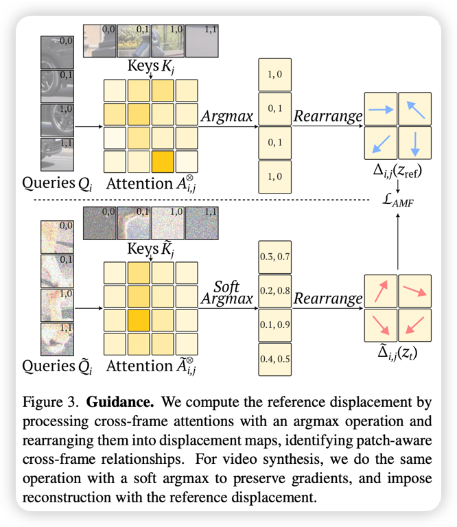 <ul class="dashed" data-apple-notes-indent-amount="0"><li><span style="font-family: '.PingFangUITextSC-Regular'">文章标题:</span>Video Motion Transfer with Diffusion Transformers</li><li><span style="font-family: '.PingFangSC-Regular'">文章地址:</span><a href="https://arxiv.org/abs/2412.07776">https://arxiv.org/abs/2412.07776</a> </li><li>CVPR 2025</li></ul> <img src="https://imagedelivery.net/phxEHgsq3j8gSnfNAJVJSQ/NODE2_D1E2B358-E852-4BBA-9B90-946A547B6FA8/public" style="background-color:initial;max-width:min(100%,1208px);max-height:min(1070px);;background-image:url(https://imagedelivery.net/phxEHgsq3j8gSnfNAJVJSQ/NODE2_D1E2B358-E852-4BBA-9B90-946A547B6FA8/public);height:auto;width:100%;object-fit:cover;background-size:cover;display:block;" width="1208" height="1070"> 文章提出了首个基于DiT的动作转移方法DiTFlow。对于动作模式的提取,其用参考视频进行编码后以t=0输入到DiT当中,对其特征进行分析获得参考视频的动作信号,这同样避免了DDIM反转的过程。具体来说,针对某层DiT block,计算不同帧间的attention矩阵,其编码了不同帧的patch之间的对应关系。基于此,该方法使用注意力动作流(AMF)来作为参考视频的动作模式,其对attention矩阵进行argmax,即得到了帧间patch的转移向量。从而将该AMF作为gt引导目标视频的去噪过程,具体来说就是在去噪时同样提取目标过程的AMF(此为attention加权偏移向量),然后进行损失的计算,对zt进行更新,实现了动作模式的学习。 <img src="https://imagedelivery.net/phxEHgsq3j8gSnfNAJVJSQ/NODE2_B2F0EDFD-D6F5-4C0D-929E-1F83F2D0AE46/public" style="background-color:initial;max-width:min(100%,1050px);max-height:min(1210px);;background-image:url(https://imagedelivery.net/phxEHgsq3j8gSnfNAJVJSQ/NODE2_B2F0EDFD-D6F5-4C0D-929E-1F83F2D0AE46/public);height:auto;width:100%;object-fit:cover;background-size:cover;display:block;" width="1050" height="1210"> 此外,若不对zt进行优化,而对位置编码进行优化,则可以将优化过后的位置编码迁移到其他不同的prompt中,该过程就可以省略优化的过程。 <ul class="dashed" data-apple-notes-indent-amount="0"><li>模型:基于CogVideoX</li><li>数据:无需训练数据</li><li>指标:MF(某篇文章的动作保留计算方式);IQ(利用CLIP计算视频帧与文本相似度)</li><li>硬件:1 A40</li><li>开源:<a href="https://ditflow.github.io">https://ditflow.github.io</a> </li></ul>
