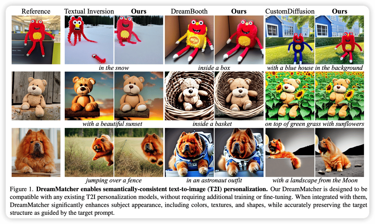 <ul class="dashed" data-apple-notes-indent-amount="0"><li><span style="font-family: '.PingFangUITextSC-Regular'">文章标题:</span>DreamMatcher: Appearance Matching Self-Attention for Semantically-Consistent Text-to-Image Personalization</li><li><span style="font-family: '.PingFangSC-Regular'">文章地址:</span><a href="https://arxiv.org/abs/2402.09812">https://arxiv.org/abs/2402.09812</a> </li><li>CVPR 2024</li></ul> <img src="https://imagedelivery.net/phxEHgsq3j8gSnfNAJVJSQ/NODE2_C174856F-E217-4384-B0B3-B4F9FB6D9899/public" style="background-color:initial;max-width:min(100%,2382px);max-height:min(948px);;background-image:url(https://imagedelivery.net/phxEHgsq3j8gSnfNAJVJSQ/NODE2_C174856F-E217-4384-B0B3-B4F9FB6D9899/public);height:auto;width:100%;object-fit:cover;background-size:cover;display:block;" width="2382" height="948"><ul class="dashed" data-apple-notes-indent-amount="0"><li></li></ul> 该文章是在定制化生成模型基础上增强生成质量的方法。 具体来说先将参考图像进行DDIM反转得到其扩散过程,然后在目标图像生成的过程中,将参考过程Self-Attention中的Value经过所谓的语义配对变形后替换到目标过程的value中,这里涉及到变形场的概念,需要学一下,大致就是 <img src="https://imagedelivery.net/phxEHgsq3j8gSnfNAJVJSQ/NODE2_7C13D354-2EF7-4FB0-94D3-16BDBEE5CFBD/public" style="background-color:initial;max-width:min(100%,2352px);max-height:min(1404px);;background-image:url(https://imagedelivery.net/phxEHgsq3j8gSnfNAJVJSQ/NODE2_7C13D354-2EF7-4FB0-94D3-16BDBEE5CFBD/public);height:auto;width:100%;object-fit:cover;background-size:cover;display:block;" width="2352" height="1404">
