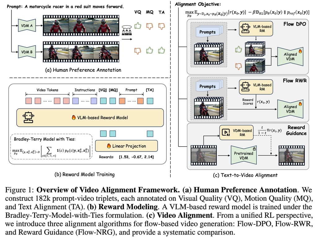<ul class="dashed" data-apple-notes-indent-amount="0"><li><span style="font-family: '.PingFangUITextSC-Regular'">文章标题:</span>Improving Video Generation with Human Feedback</li><li><span style="font-family: '.PingFangSC-Regular'">文章地址:</span><a href="https://arxiv.org/abs/2501.13918">https://arxiv.org/abs/2501.13918</a> </li><li>NeurIPS 2025</li></ul> <img src="https://imagedelivery.net/phxEHgsq3j8gSnfNAJVJSQ/node3_ec1bf282-f561-4554-be9c-7be88cccb23f/public" style="background-color:initial;max-width:min(100%,3356px);max-height:min(2502px);;background-image:url(https://imagedelivery.net/phxEHgsq3j8gSnfNAJVJSQ/node3_ec1bf282-f561-4554-be9c-7be88cccb23f/public);height:auto;width:100%;object-fit:cover;background-size:cover;display:block;" width="3356" height="2502"> 文章针对视频生成模型的RLHF进行创新。首先提出了一个大规模的偏好数据集,解决了之前的数据集分辨率低等缺点;提出了多维度的奖励模型,训练VLM来对视频进行偏好训练;随后利用训练好的奖励模型,设计了流模型的强化学习算法,训练时策略(Flow-DPO, FlowRWR),以及推理时策略(Flow-NRG)。 Flow-DPO伪代码: <a href="../../../../files/Accounts/C037F400-EC11-4FAB-ACA5-467EE47E1BD1/Media/4BF48050-2FFB-4633-B946-49B3DC718BB0/1_BCF60CA6-53A5-46BF-916F-EAF0EFF55991/Pasted%20Graphic%202.tiff" class="attr" data-apple-notes-zidentifier="5D28769A-1555-4474-B8E1-AFDA63F4529C"></a>