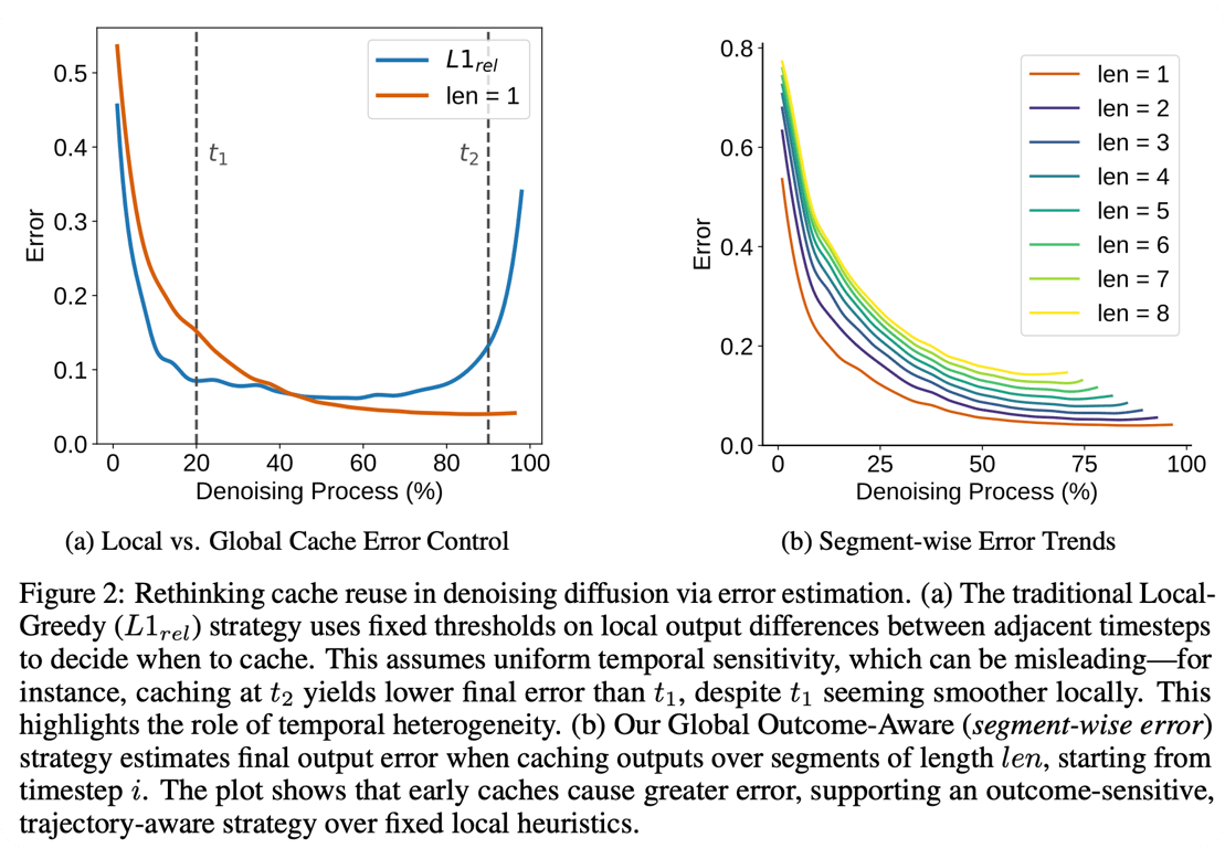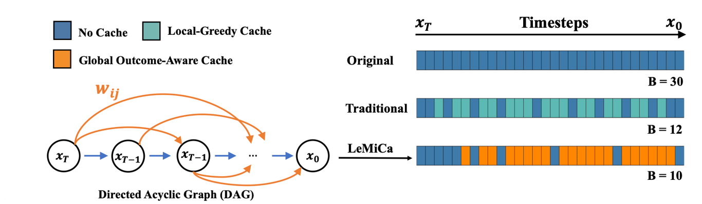 <ul class="dashed" data-apple-notes-indent-amount="0"><li><span style="font-family: '.PingFangUITextSC-Regular'">文章标题:</span>LeMiCa: Lexicographic Minimax Path Caching for Efficient Diffusion-Based Video Generation</li><li><span style="font-family: '.PingFangSC-Regular'">文章地址:</span><a href="https://arxiv.org/abs/2511.00090">https://arxiv.org/abs/2511.00090</a> </li><li>NIPS 2025</li></ul> <img src="https://imagedelivery.net/phxEHgsq3j8gSnfNAJVJSQ/node3_c1d4e10d-abda-46f4-b6b7-031cf7ac9a51/public" style="background-color:initial;max-width:min(100%,1590px);max-height:min(464px);;background-image:url(https://imagedelivery.net/phxEHgsq3j8gSnfNAJVJSQ/node3_c1d4e10d-abda-46f4-b6b7-031cf7ac9a51/public);height:auto;width:100%;object-fit:cover;background-size:cover;display:block;" width="1590" height="464"> 作者首先提出,之前的cache方法是局部贪婪的算法(即根据当前模型输出来判断是否cache),这样做有一个问题就是把所有时间步都看作是一样的,但其实不同的时间步具有异质性,如初始步数通常注重布局的生成从而更重要,后续的步数尽管可能相邻步数差异较大,但对总体结果影响不大(如下图的t1和t2)。作者也通过实验分析并证实了这一想法。 <img src="https://imagedelivery.net/phxEHgsq3j8gSnfNAJVJSQ/node3_68970882-ab40-42ca-9406-c08068d82036/public" style="background-color:initial;max-width:min(100%,1774px);max-height:min(1228px);;background-image:url(https://imagedelivery.net/phxEHgsq3j8gSnfNAJVJSQ/node3_68970882-ab40-42ca-9406-c08068d82036/public);height:auto;width:100%;object-fit:cover;background-size:cover;display:block;" width="1774" height="1228"> 图中a可以看到,若只cache一步,在扩散过程前部分cache相较于后部分通常会引入更大的error,cache多步亦是如此,如上图b。 这里作者引入了全局输出loss,来衡量某部分cache对最终输出带来的误差。 <img src="https://imagedelivery.net/phxEHgsq3j8gSnfNAJVJSQ/node3_532a9ffe-46a5-4fcc-b4cd-68660f7069d4/public" style="background-color:initial;max-width:min(100%,912px);max-height:min(154px);;background-image:url(https://imagedelivery.net/phxEHgsq3j8gSnfNAJVJSQ/node3_532a9ffe-46a5-4fcc-b4cd-68660f7069d4/public);height:auto;width:100%;object-fit:cover;background-size:cover;display:block;" width="912" height="154"> 因此,作者提出了一个全新的算法来进行cache。首先作者将反推过程看作一个有向无环图(DAG),边的权重即由状态i到j进行cache后的全局loss,因此,问题就转变成从初始状态到最终状态的最优路径。边的权重由多个prompt进行推理进行统计得到。值得注意的是,这里作者定义最优路径并非损失和最大的,因为整个扩散过程的损失不是相加的和马尔可夫性的,作者定义最优路径为:最小的最大权重边的路径(即将所有路径的边权重按大小排序,从左到右进行词排序,选取最小的路径)具体算法如下: <img src="https://imagedelivery.net/phxEHgsq3j8gSnfNAJVJSQ/node3_9dcbe5f7-6d45-4b92-bbdf-90ae0be37c5b/public" style="background-color:initial;max-width:min(100%,1784px);max-height:min(1332px);;background-image:url(https://imagedelivery.net/phxEHgsq3j8gSnfNAJVJSQ/node3_9dcbe5f7-6d45-4b92-bbdf-90ae0be37c5b/public);height:auto;width:100%;object-fit:cover;background-size:cover;display:block;" width="1784" height="1332"> 豆包解释得很好。 可改进的点: 1、整个图是离线构造的,且由多个prompt进行统计得到,没有针对不同的prompt进行适配。 2、实际上这是对所有cache方案进行损失估计的简化,如果对所有cache方案(所有segment的cache)进行统计分析肯定是更好的(但组合方案太多),而该方法通过图(单segment)和最小最大路径选择对其进行简化,这样有点粗糙了,能否有更精细的方案? <ul class="dashed" data-apple-notes-indent-amount="0"><li>开源:<a href="https://github.com/UnicomAI/LeMiCa">https://github.com/UnicomAI/LeMiCa</a> </li></ul>