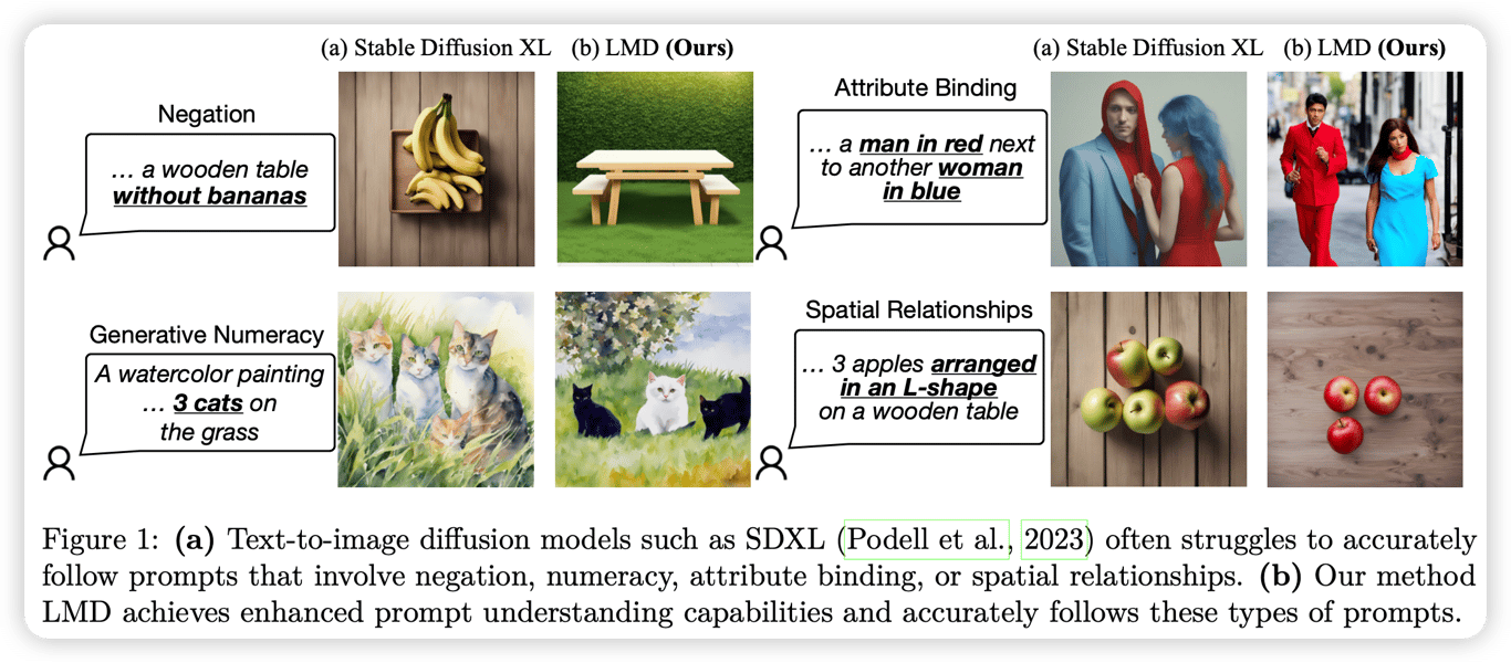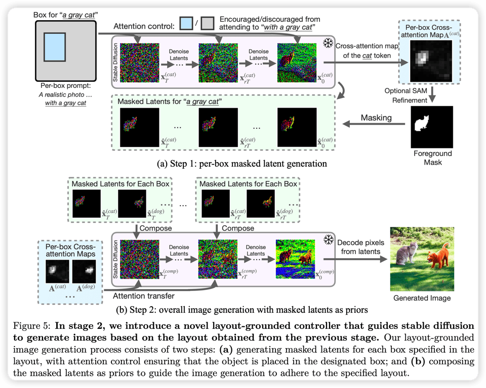 <ul class="dashed" data-apple-notes-indent-amount="0"><li><span style="font-family: '.PingFangUITextSC-Regular'">文章标题:</span>LLM-grounded Diffusion: Enhancing Prompt Understanding of Text-to-Image Diffusion Models with Large Language Models</li><li><span style="font-family: '.PingFangSC-Regular'">文章地址:</span><a href="https://arxiv.org/abs/2305.13655">https://arxiv.org/abs/2305.13655</a> </li><li>TMLR 2024</li></ul> <img src="https://imagedelivery.net/phxEHgsq3j8gSnfNAJVJSQ/NODE2_579DFC20-D17C-4B26-8C7A-4BDA50D9FE17/public" style="background-color:initial;max-width:min(100%,2232px);max-height:min(848px);;background-image:url(https://imagedelivery.net/phxEHgsq3j8gSnfNAJVJSQ/NODE2_579DFC20-D17C-4B26-8C7A-4BDA50D9FE17/public);height:auto;width:100%;object-fit:cover;background-size:cover;display:block;" width="2232" height="848"> 这篇文章针对文生图扩散模型对于那些复杂的prompt(包含数量、空间关系等)的生成效果不好做出了改进。方法包含两个阶段,首先使用LLM对prompt进行分析,生成图片的布局等信息;第二个阶段即根据布局进行进行扩散生成。 <img src="https://imagedelivery.net/phxEHgsq3j8gSnfNAJVJSQ/NODE2_4DFB9424-5B6F-4669-B02A-9580806965BC/public" style="background-color:initial;max-width:min(100%,2232px);max-height:min(1784px);;background-image:url(https://imagedelivery.net/phxEHgsq3j8gSnfNAJVJSQ/NODE2_4DFB9424-5B6F-4669-B02A-9580806965BC/public);height:auto;width:100%;object-fit:cover;background-size:cover;display:block;" width="2232" height="1784"> 第一阶段好理解,第二阶段具体来说就是首先对每一个对象框,联合背景,以及他们的prompt进行单独的扩散,其中通过将cross-attention map约束到该对象框中,来优化图像隐变量,从而实现整个扩散过程主要在框中进行。在生成完成后,使用目标对象token的cross-attention map作为mask,将每个时间步的隐变量进行处理,得到了只关于该对象在特定位置的隐变量。得到所有对象的隐变量后,将它们组合起来进行最终图的扩散过程,在这个过程中,还使用了所有对象的cross-attention map对该扩散过程进行约束,即将对应token的cross-attention map进行替换。最终生成目标图像。 <img src="https://imagedelivery.net/phxEHgsq3j8gSnfNAJVJSQ/NODE2_DE846472-696A-4D8B-819F-723608FC5E27/public" style="background-color:initial;max-width:min(100%,2232px);max-height:min(982px);;background-image:url(https://imagedelivery.net/phxEHgsq3j8gSnfNAJVJSQ/NODE2_DE846472-696A-4D8B-819F-723608FC5E27/public);height:auto;width:100%;object-fit:cover;background-size:cover;display:block;" width="2232" height="982"> <ul class="dashed" data-apple-notes-indent-amount="0"><li>数据:无需训练</li><li>指标:自己提出了BenchMark</li><li>硬件:未提及</li><li>开源:<a href="https://llm-grounded-diffusion.github.io">https://llm-grounded-diffusion.github.io</a> </li></ul>