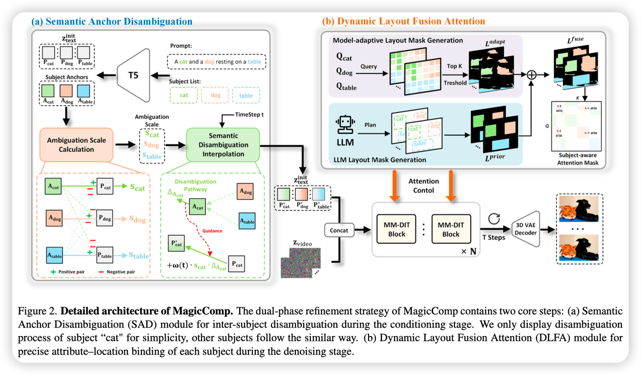 <ul class="dashed" data-apple-notes-indent-amount="0"><li><span style="font-family: '.PingFangUITextSC-Regular'">文章标题:</span>MagicComp: Training-free Dual-Phase Refinement for Compositional Video Generation</li><li><span style="font-family: '.PingFangSC-Regular'">文章地址:</span><a href="https://arxiv.org/abs/2503.14428">https://arxiv.org/abs/2503.14428</a> </li><li>arxiv</li></ul> <img src="https://imagedelivery.net/phxEHgsq3j8gSnfNAJVJSQ/NODE2_B590DBF6-3E30-4313-B007-86B78E7ED967/public" style="background-color:initial;max-width:min(100%,1882px);max-height:min(1230px);;background-image:url(https://imagedelivery.net/phxEHgsq3j8gSnfNAJVJSQ/NODE2_B590DBF6-3E30-4313-B007-86B78E7ED967/public);height:auto;width:100%;object-fit:cover;background-size:cover;display:block;" width="1882" height="1230"> 文章针对文生视频模型中的组合视频生成(多主体)存在的问题(属性混乱、位置错误等)进行了training-free的优化,具体来说,方法分为两个阶段:1、在条件阶段,对主体token的embedding进行优化(原prompt经过编码器后,主体token的embedding会出现混淆的情况)2、在去噪阶段,对指定token的attention进行mask优化,使其关注指定区域。 <img src="https://imagedelivery.net/phxEHgsq3j8gSnfNAJVJSQ/NODE2_8AA0313F-6ABF-40E6-B896-E08898CB6AB0/public" style="background-color:initial;max-width:min(100%,1874px);max-height:min(1096px);;background-image:url(https://imagedelivery.net/phxEHgsq3j8gSnfNAJVJSQ/NODE2_8AA0313F-6ABF-40E6-B896-E08898CB6AB0/public);height:auto;width:100%;object-fit:cover;background-size:cover;display:block;" width="1874" height="1096"> <ul class="dashed" data-apple-notes-indent-amount="0"><li>数据:无需训练数据</li><li>指标:T2V-CompBench; VBench</li><li>硬件:1 A100</li><li>开源:<a href="https://hong-yu-zhang.github.io/MagicComp-Page/">https://hong-yu-zhang.github.io/MagicComp-Page/</a> </li></ul>