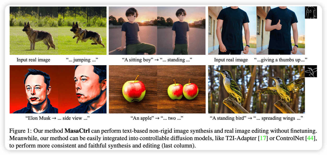 <ul class="dashed" data-apple-notes-indent-amount="0"><li><span style="font-family: '.PingFangUITextSC-Regular'">文章标题:</span>MasaCtrl: Tuning-Free Mutual Self-Attention Control for Consistent Image Synthesis and Editing</li><li><span style="font-family: '.PingFangSC-Regular'">文章地址:</span><a href="https://arxiv.org/abs/2304.08465">https://arxiv.org/abs/2304.08465</a> </li><li>ICCV 2023</li></ul> <img src="https://imagedelivery.net/phxEHgsq3j8gSnfNAJVJSQ/NODE2_6C8A544C-1445-490C-8DAA-234142A06C2C/public" style="background-color:initial;max-width:min(100%,2346px);max-height:min(1350px);;background-image:url(https://imagedelivery.net/phxEHgsq3j8gSnfNAJVJSQ/NODE2_6C8A544C-1445-490C-8DAA-234142A06C2C/public);height:auto;width:100%;object-fit:cover;background-size:cover;display:block;" width="2346" height="1350"> 文章提出了一个无需训练即可对图像进行一致性生成或编辑的方法,也可以用于真实图像。 方法非常简单,就是通过将原图像的扩散过程作为参考(真实图像进行DDIM Inversion),引导目标图像的生成。具体来说,首先从与原扩散过程相同的噪声开始进行扩散,到了特定的时间步,修改self-attention为mutual self-attention,即保留Query,而Key和Value从参考过程中对应的self-attention层中获取,从而将参考图像信息融入扩散过程,实现一致性。为了避免主体与背景间的attention干扰,作者使用了cross-attention能反映布局的特性,使用cross-attention map作为mask,作用于mutual self-attention从而避免背景与主体干扰。同时该方法可以与一些布局引导的方法结合起来,实现想要的编辑效果。 <img src="https://imagedelivery.net/phxEHgsq3j8gSnfNAJVJSQ/NODE2_F7F2231F-67C1-4C90-8A86-D77326E68B66/public" style="background-color:initial;max-width:min(100%,2382px);max-height:min(1134px);;background-image:url(https://imagedelivery.net/phxEHgsq3j8gSnfNAJVJSQ/NODE2_F7F2231F-67C1-4C90-8A86-D77326E68B66/public);height:auto;width:100%;object-fit:cover;background-size:cover;display:block;" width="2382" height="1134"> <ul class="dashed" data-apple-notes-indent-amount="0"><li>数据:无需训练</li><li>指标:无</li><li>硬件:未提及</li><li>开源:<a href="https://github.com/TencentARC/MasaCtrl">https://github.com/TencentARC/MasaCtrl</a> </li></ul>