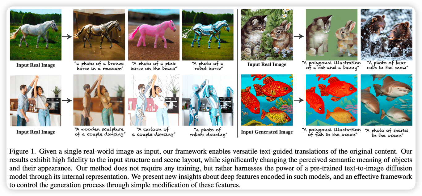 <ul class="dashed" data-apple-notes-indent-amount="0"><li><span style="font-family: '.PingFangUITextSC-Regular'">文章标题:</span>Plug-and-Play Diffusion Features for Text-Driven Image-to-Image Translation</li><li><span style="font-family: '.PingFangSC-Regular'">文章地址:</span><a href="https://arxiv.org/abs/2211.12572">https://arxiv.org/abs/2211.12572</a> </li><li>CVPR 2023</li></ul> <img src="https://imagedelivery.net/phxEHgsq3j8gSnfNAJVJSQ/NODE2_08F6C66F-2D94-4342-9C05-E689720185E7/public" style="background-color:initial;max-width:min(100%,2350px);max-height:min(1090px);;background-image:url(https://imagedelivery.net/phxEHgsq3j8gSnfNAJVJSQ/NODE2_08F6C66F-2D94-4342-9C05-E689720185E7/public);height:auto;width:100%;object-fit:cover;background-size:cover;display:block;" width="2350" height="1090"><ul class="dashed" data-apple-notes-indent-amount="0"><li></li></ul> 文章任务为利用文本对真实图像进行编辑,且其布局不变。 作者通过对扩散模型内部的特征表示进行分析,发现其decoder部分中间层的空间特征能够反映不同的语义区域,并且其self-attention矩阵也有类似的特点(这里有点问题),因此,将真实图像进行DDIM Inversion后(无文本引导),将其中间特征和SA注入到编辑文本引导的扩散过程中(特定时间步,特定层),实现在保证真实图像语义布局不变的情况下,对图像进行满足文本的编辑。 这篇文章同时也反映出,SA map也与图像的布局息息相关。 <img src="https://imagedelivery.net/phxEHgsq3j8gSnfNAJVJSQ/NODE2_CDC887F3-1CF5-4452-B5F6-0D176479902A/public" style="background-color:initial;max-width:min(100%,2348px);max-height:min(1096px);;background-image:url(https://imagedelivery.net/phxEHgsq3j8gSnfNAJVJSQ/NODE2_CDC887F3-1CF5-4452-B5F6-0D176479902A/public);height:auto;width:100%;object-fit:cover;background-size:cover;display:block;" width="2348" height="1096"> <ul class="dashed" data-apple-notes-indent-amount="0"><li>数据:无需训练</li><li>指标:CLIP-T(判断编辑图像与文本对齐度);DINO(判断与原图结构相似度)</li><li>硬件:未提及</li><li>开源:<a href="https://github.com/MichalGeyer/plug-and-play">https://github.com/MichalGeyer/plug-and-play</a> </li></ul>