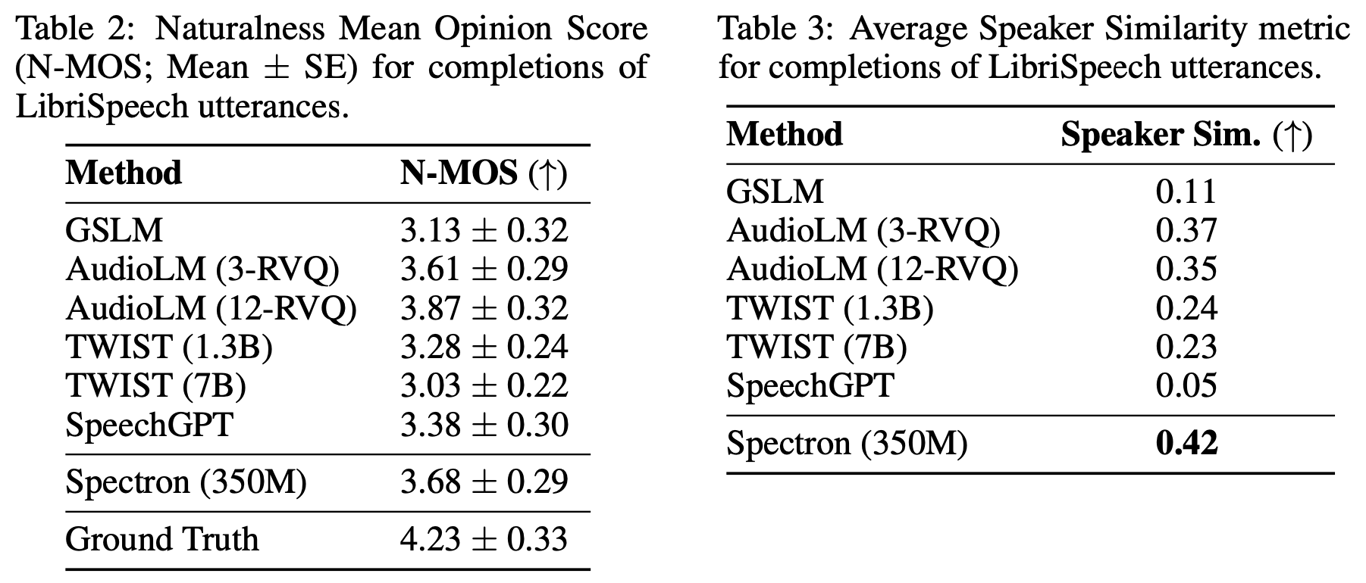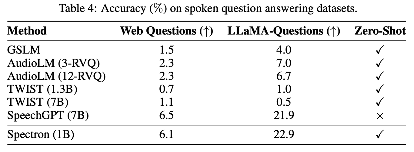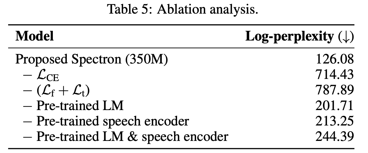 <img src="https://imagedelivery.net/phxEHgsq3j8gSnfNAJVJSQ/NODE2_F9863908-B22F-4AE7-BBB0-86C3DFEC5B50/public" style="background-color:initial;max-width:min(100%,1898px);max-height:min(1344px);;background-image:url(https://imagedelivery.net/phxEHgsq3j8gSnfNAJVJSQ/NODE2_F9863908-B22F-4AE7-BBB0-86C3DFEC5B50/public);height:auto;width:100%;object-fit:cover;background-size:cover;display:block;" width="1898" height="1344"> <ul class="dashed" data-apple-notes-indent-amount="0"><li><span style="font-family: '.PingFangSC-Regular'">文章标题:</span>SPOKEN QUESTION ANSWERING AND SPEECH CONTINUATION USING SPECTROGRAM-POWERED LLM</li><li><span style="font-family: '.PingFangSC-Regular'">文章地址:</span><a href="https://arxiv.org/abs/2305.15255">https://arxiv.org/abs/2305.15255</a> </li><li>ICLR 2024</li></ul> 文章提出了Spectron,一个全新的使用预训练LLM去完成语音问答和语音生成的模型。通过在LLM中增加预训练的语音编码器,使模型具有了语音的输入和输出的能力。整个模型是端到端训练的,并且直接在频谱图上进行,简化了模型的结构。该方法的关键在于模型同时将语音识别,文本续写和语音生成作为训练目标,且只使用了文本-语音对数据,使得模型在只有一个解码阶段具有跨模态的思维链能力。 模型的结构如主图,使用了预训练的语音编码器和预训练的LM。编码器将一段语音作为输入进行编码,随后输入到LM中作为prefix前缀(注意模型中的LM为prefix-decoder架构),随后LM进行token预测,进行文本内容的识别与续写,随后再对语音内容进行预测。具体过程在下面介绍。 在训练阶段,一段语音被分为两段,前一段作为encoder输入,后一段作为模型预测的GT,相应的文本也会分为两段。随后语音编码器将前一段语音进行编码和维度转换输入到LM中作为prefix,LM解码生成文本内容。最后为了使LM具有输入和输出语音的能力,作者加入了Pre-net和Post-net用于处理输入和输出频谱图,有了这两个网络的处理,使得模型能够预测语音内容。模型的损失函数分成两部分,首先是语音识别和文本生成,该部分主要用于训练模型的语音识别和基于文本的问答能力,第二部分是语音生成,该部分主要训练模型的语音回答能力,式子如下: <img src="https://imagedelivery.net/phxEHgsq3j8gSnfNAJVJSQ/NODE2_36BF1054-030F-4CEB-95EA-F4CFE19AEDAC/public" style="background-color:initial;max-width:min(100%,1124px);max-height:min(82px);;background-image:url(https://imagedelivery.net/phxEHgsq3j8gSnfNAJVJSQ/NODE2_36BF1054-030F-4CEB-95EA-F4CFE19AEDAC/public);height:auto;width:100%;object-fit:cover;background-size:cover;display:block;" width="1124" height="82"> <img src="https://imagedelivery.net/phxEHgsq3j8gSnfNAJVJSQ/NODE2_2068E6E4-F9FD-4A72-957E-C4A9C8843AFA/public" style="background-color:initial;max-width:min(100%,1208px);max-height:min(156px);;background-image:url(https://imagedelivery.net/phxEHgsq3j8gSnfNAJVJSQ/NODE2_2068E6E4-F9FD-4A72-957E-C4A9C8843AFA/public);height:auto;width:100%;object-fit:cover;background-size:cover;display:block;" width="1208" height="156"> <img src="https://imagedelivery.net/phxEHgsq3j8gSnfNAJVJSQ/NODE2_BE1AD835-A0D1-40BC-B605-38B95347D246/public" style="background-color:initial;max-width:min(100%,892px);max-height:min(318px);;background-image:url(https://imagedelivery.net/phxEHgsq3j8gSnfNAJVJSQ/NODE2_BE1AD835-A0D1-40BC-B605-38B95347D246/public);height:auto;width:100%;object-fit:cover;background-size:cover;display:block;" width="892" height="318"> <img src="https://imagedelivery.net/phxEHgsq3j8gSnfNAJVJSQ/NODE2_6C5FA2C2-957D-4409-97FB-9E4E1123D763/public" style="background-color:initial;max-width:min(100%,1070px);max-height:min(84px);;background-image:url(https://imagedelivery.net/phxEHgsq3j8gSnfNAJVJSQ/NODE2_6C5FA2C2-957D-4409-97FB-9E4E1123D763/public);height:auto;width:100%;object-fit:cover;background-size:cover;display:block;" width="1070" height="84"> <img src="https://imagedelivery.net/phxEHgsq3j8gSnfNAJVJSQ/NODE2_81F785BC-E826-4FD1-B08E-271E0C4CA18D/public" style="background-color:initial;max-width:min(100%,872px);max-height:min(90px);;background-image:url(https://imagedelivery.net/phxEHgsq3j8gSnfNAJVJSQ/NODE2_81F785BC-E826-4FD1-B08E-271E0C4CA18D/public);height:auto;width:100%;object-fit:cover;background-size:cover;display:block;" width="872" height="90"> 在推理阶段,输入一段语音,该语音作为语音编码器的输入,进行编码和维度转换后输入到LM中,LM通过自回归的方式依次生成对应文本、文本续写和语音频谱,最后,声码器将频谱转化为音频输出。 作者进行了对比实验和消融实验证明了模型在语义质量,语音质量和回答准确度上的有效性。 <img src="https://imagedelivery.net/phxEHgsq3j8gSnfNAJVJSQ/NODE2_3F183534-6BB3-47E4-A2E1-BB0E0755A8A2/public" style="background-color:initial;max-width:min(100%,1886px);max-height:min(630px);;background-image:url(https://imagedelivery.net/phxEHgsq3j8gSnfNAJVJSQ/NODE2_3F183534-6BB3-47E4-A2E1-BB0E0755A8A2/public);height:auto;width:100%;object-fit:cover;background-size:cover;display:block;" width="1886" height="630"> <img src="https://imagedelivery.net/phxEHgsq3j8gSnfNAJVJSQ/NODE2_8681DB64-9877-43AA-AC65-18046D7C835F/public" style="background-color:initial;max-width:min(100%,1802px);max-height:min(770px);;background-image:url(https://imagedelivery.net/phxEHgsq3j8gSnfNAJVJSQ/NODE2_8681DB64-9877-43AA-AC65-18046D7C835F/public);height:auto;width:100%;object-fit:cover;background-size:cover;display:block;" width="1802" height="770"> <img src="https://imagedelivery.net/phxEHgsq3j8gSnfNAJVJSQ/NODE2_97C8EE81-2B7A-4AF1-B10C-D969108FB902/public" style="background-color:initial;max-width:min(100%,1622px);max-height:min(598px);;background-image:url(https://imagedelivery.net/phxEHgsq3j8gSnfNAJVJSQ/NODE2_97C8EE81-2B7A-4AF1-B10C-D969108FB902/public);height:auto;width:100