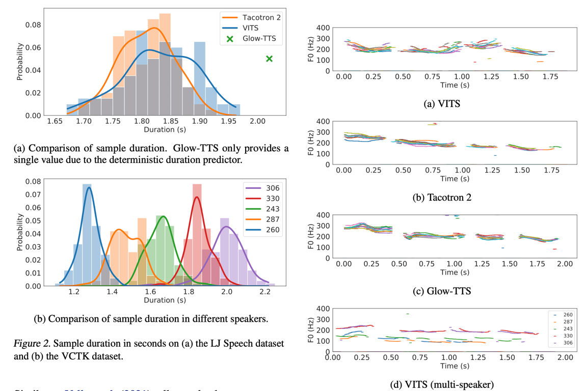 <ul class="dashed" data-apple-notes-indent-amount="0"><li><span style="font-family: '.PingFangSC-Regular'">文章标题:</span>Conditional Variational Autoencoder with Adversarial Learning for End-to-End Text-to-Speech</li><li><span style="font-family: '.PingFangSC-Regular'">文章地址:</span><a href="https://arxiv.org/abs/2106.06103">https://arxiv.org/abs/2106.06103</a> </li><li>ICML 2021</li></ul> <img src="https://imagedelivery.net/phxEHgsq3j8gSnfNAJVJSQ/NODE2_8B557D35-9FF2-4AFE-83E5-F644BAAE1977/public" style="background-color:initial;max-width:min(100%,2300px);max-height:min(1334px);;background-image:url(https://imagedelivery.net/phxEHgsq3j8gSnfNAJVJSQ/NODE2_8B557D35-9FF2-4AFE-83E5-F644BAAE1977/public);height:auto;width:100%;object-fit:cover;background-size:cover;display:block;" width="2300" height="1334"> 文章提出了VITS,一种并行的端到端的TTS模型,能比传统两阶段的方法生成更自然的声音。该方法采用了与归一化流模型协同的变分增强推理方法,该方法可以增强建模的表达能力。为了生成多样的语音节奏,模型提出了随机间隔预测器。基于隐空间建模和语音持续时间的不确定性,模型可以对同一个文本对应多种韵律和节奏。在人类评判基准MOS中,模型超越了所有公开的TTS模型,接近GT的水平。 在神经网络的影响下,大多TTS系统分为两阶段,第一个阶段为将文本建模转化成语音中间表示(如梅尔频谱、语音特征等),第二个阶段就是基于这些中间表示还原语音。这两阶段相互独立发展。两阶段有个弊端就是后阶段模型的训练需要用到前阶段模型采样的结果,这会导致模型性能下降。文章提出了一种并行端到端的方法生成了比两阶段法更自然的语音。 下面介绍模型的方法。首先介绍模型的数学模型,模型可以表示为条件VAE的形式通过最大化ELBO去逼近一个复杂的分布: <img src="https://imagedelivery.net/phxEHgsq3j8gSnfNAJVJSQ/NODE2_AC313DA0-BA7C-4157-8F9B-11D0E237CA63/public" style="background-color:initial;max-width:min(100%,986px);max-height:min(134px);;background-image:url(https://imagedelivery.net/phxEHgsq3j8gSnfNAJVJSQ/NODE2_AC313DA0-BA7C-4157-8F9B-11D0E237CA63/public);height:auto;width:100%;object-fit:cover;background-size:cover;display:block;" width="986" height="134"> 因此模型的损失可以分为两部分:第一项,也就是重建损失,和第二项KL散度。这两项的公式分别为: <img src="https://imagedelivery.net/phxEHgsq3j8gSnfNAJVJSQ/NODE2_3A8A0468-1E29-44CE-BC35-986DDF27AF5F/public" style="background-color:initial;max-width:min(100%,516px);max-height:min(84px);;background-image:url(https://imagedelivery.net/phxEHgsq3j8gSnfNAJVJSQ/NODE2_3A8A0468-1E29-44CE-BC35-986DDF27AF5F/public);height:auto;width:100%;object-fit:cover;background-size:cover;display:block;" width="516" height="84"> <img src="https://imagedelivery.net/phxEHgsq3j8gSnfNAJVJSQ/NODE2_3B72C4BA-0FE7-4D0E-B957-B3401F1C2451/public" style="background-color:initial;max-width:min(100%,878px);max-height:min(150px);;background-image:url(https://imagedelivery.net/phxEHgsq3j8gSnfNAJVJSQ/NODE2_3B72C4BA-0FE7-4D0E-B957-B3401F1C2451/public);height:auto;width:100%;object-fit:cover;background-size:cover;display:block;" width="878" height="150"> 对于重建损失,模型采用的是梅尔频谱间的L1损失而非原始波形,因为梅尔频谱更符合人类的听觉。对于KL散度,模型采用的是线性尺度频谱图而非梅尔频谱,A为音素和隐变量的对齐矩阵。目前对于先验概率和后验概率的编码器都是使用的标准正态分布,要提高生成语音的真实性,先验分布的表达性是很重要的,因此作者加入了归一化流模型用于将先验分布转换成一个复杂的分布,并且这种转换是可逆的。 <img src="https://imagedelivery.net/phxEHgsq3j8gSnfNAJVJSQ/NODE2_74BCF4B1-B35C-43AB-B481-53765CBC4BD1/public" style="background-color:initial;max-width:min(100%,954px);max-height:min(194px);;background-image:url(https://imagedelivery.net/phxEHgsq3j8gSnfNAJVJSQ/NODE2_74BCF4B1-B35C-43AB-B481-53765CBC4BD1/public);height:auto;width:100%;object-fit:cover;background-size:cover;display:block;" width="954" height="194"> 然后介绍对齐的估计,作者使用了之前提出的MAS方法去计算对齐矩阵A: <img src="https://imagedelivery.net/phxEHgsq3j8gSnfNAJVJSQ/NODE2_0007E320-A9C0-4426-B1F1-9B0F6810A902/public" style="background-color:initial;max-width:min(100%,1000px);max-height:min(238px);;background-image:url(https://imagedelivery.net/phxEHgsq3j8gSnfNAJVJSQ/NODE2_0007E320-A9C0-4426-B1F1-9B0F6810A902/public);height:auto;width:100%;object-fit:cover;background-size:cover;display:block;" width="1000" height="238"> 有了对其矩阵便能得到每个隐变量确定的持续时间,这样做缺乏多样性,因此作者提出了随机持续时间预测器,引入了随机性,增加了多样性。最后便是对抗学习,作者采用了最小均方损失和特征匹配损失: <img src="https://imagedelivery.net/phxEHgsq3j8gSnfNAJVJSQ/NODE2_31812618-D3B1-4C2C-B23F-409AFC2AF8CA/public" style="background-color:initial;max-width:min(100%,988px);max-height:min(370px);;background-image:url(https://imagedelivery.net/phxEHgsq3j8gSnfNAJVJSQ/NODE2_31812618-D3B1-4C2C-B23F-409AFC2AF8CA/public);height:auto;width:100%;object-fit:cover;background-size:cover;display:block;" width="988" height="370"> 因此模型最终的损失为: <img src="https://imagedelivery.net/phxEHgsq3j8gSnfNAJVJSQ/NODE2_9E0E2852-0107-41FC-8DD2-2199214E50E2/public" style="background-color:initial;max-width:min(100%,1016px);max-height:min(96px);;background-image:url(https://imagedelivery.net/phxEHgsq3j8gSnfNAJVJSQ/NODE2_9E0E2852-0107-41FC-8DD2-2199214E50E2/public);height:auto;width:100%;object-fit:cover;background-size:cover;display:block;" width="1016" height="96"> 模型结构如主图,具体模型细节可以看原文。 作者做了大量的实验证明方